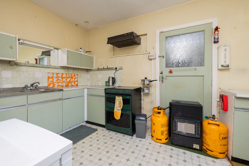 Unusually this spacious kitchen is located to the front of the property with a wonderful picture window overlooking the front garden and street beyond. The room boasts plenty of space of designated cooking and dining areas, the kitchen area features a range of wall and floor units incorporating a stainless steel sink and drainer finished with a tiled splashback. Door to side garden.
