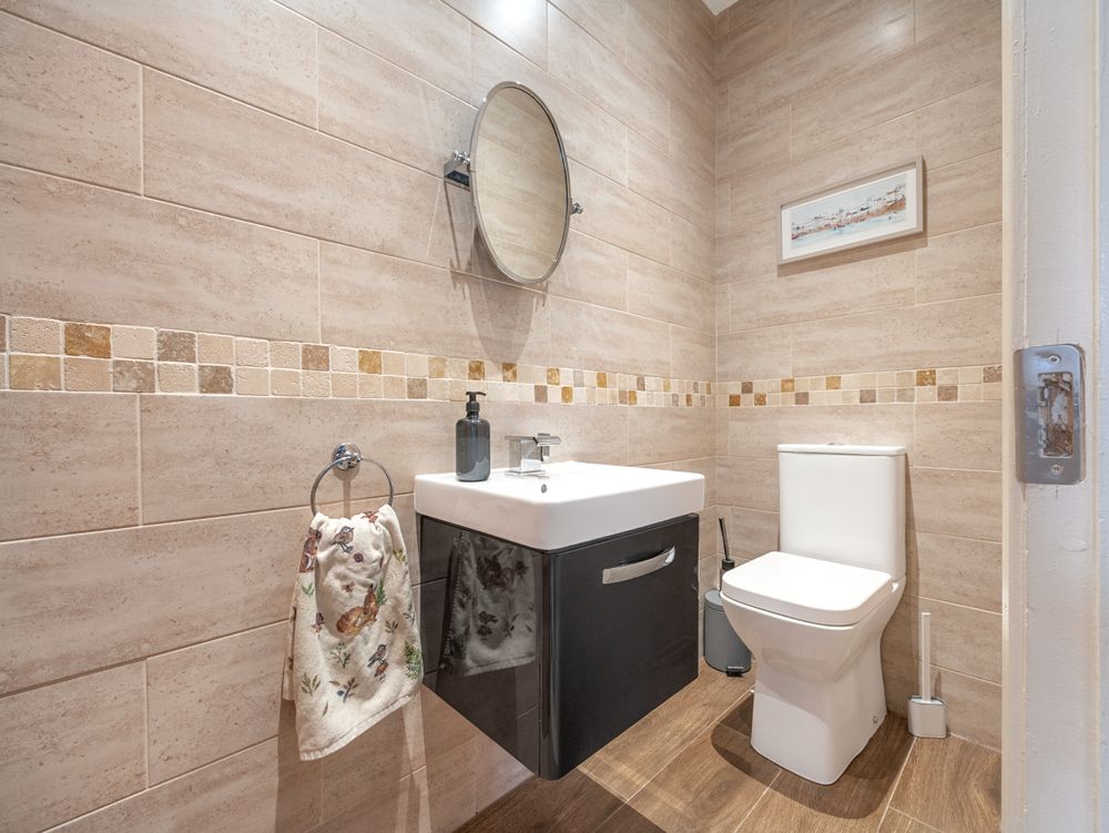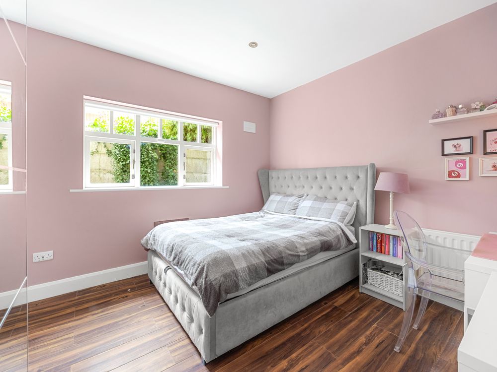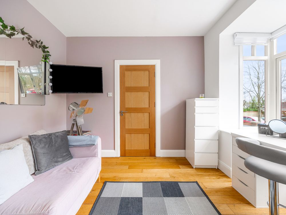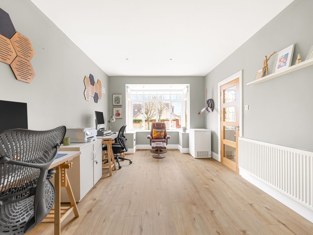 Quality greets you the moment you enter the bright and spacious entrance hall where to the right you have a spacious reception room with a bay window overlooking the front, featuring solid wood flooring, and a single door providing access to the side passage. To the left, a beautifully tiled downstairs WC and a bedroom / home office or playroom, bathed in natural light from its own bay window . To the rear of the hall lies a beautifully appointed ground floor double bedroom, enhanced by a beautifully finished, fully tiled ensuite with elegant waterfall shower.
