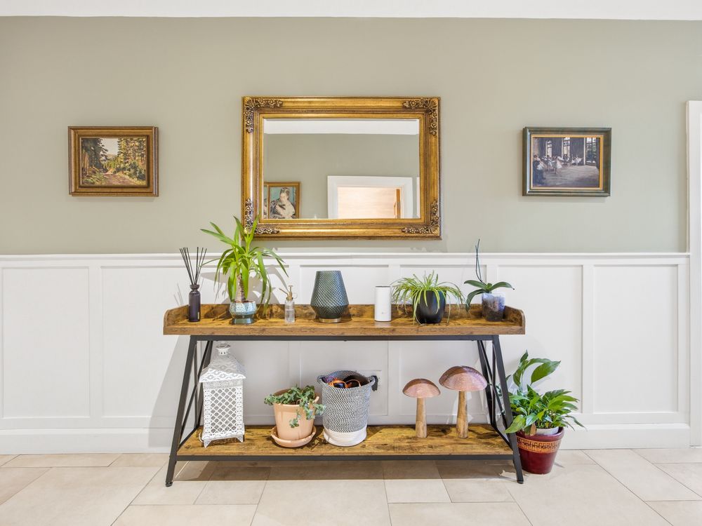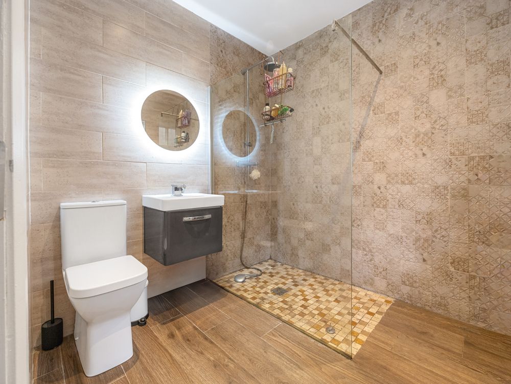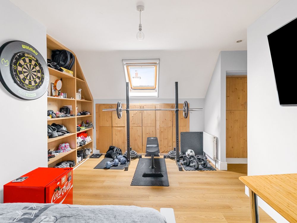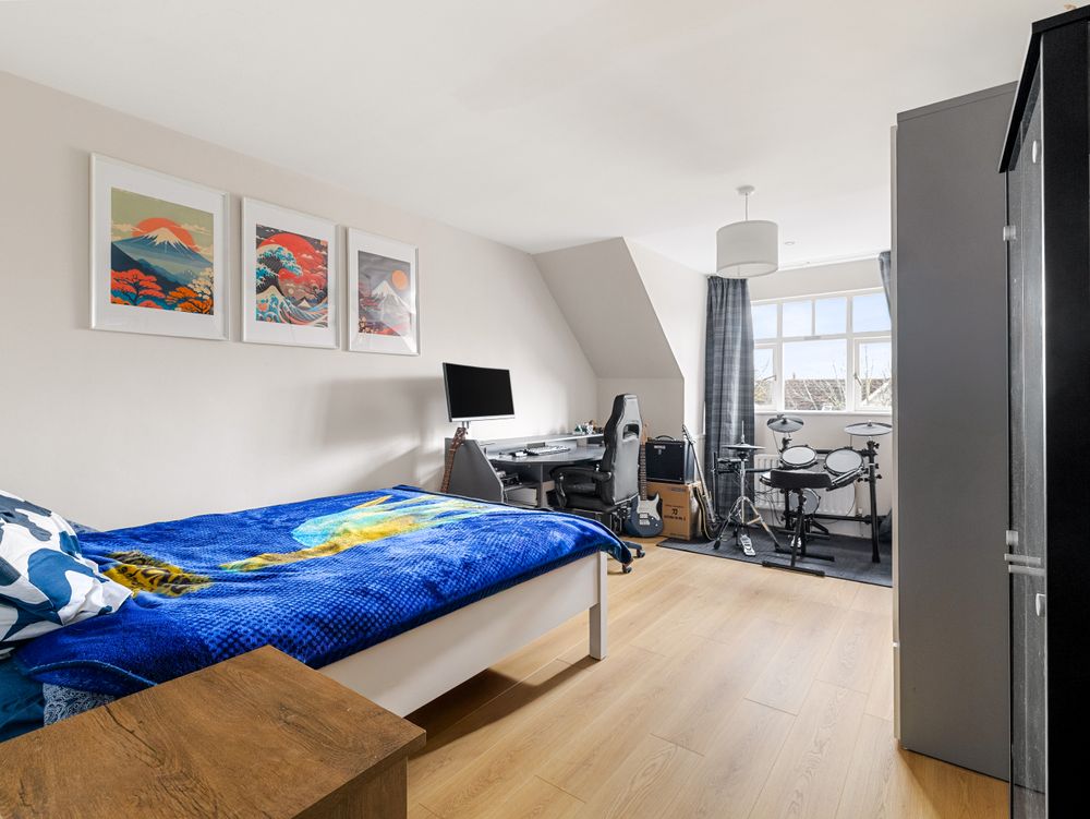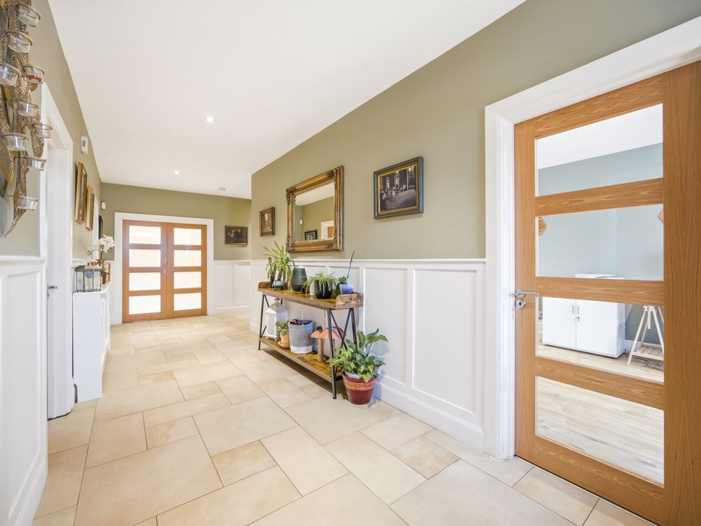 Quality greets you the moment you enter the bright and spacious entrance hall where to the right you have a spacious reception room with a bay window overlooking the front, featuring solid wood flooring, and a single door providing access to the side passage. To the left, a beautifully tiled downstairs WC and a bedroom / home office or playroom, bathed in natural light from its own bay window . To the rear of the hall lies a beautifully appointed ground floor double bedroom, enhanced by a beautifully finished, fully tiled ensuite with elegant waterfall shower.