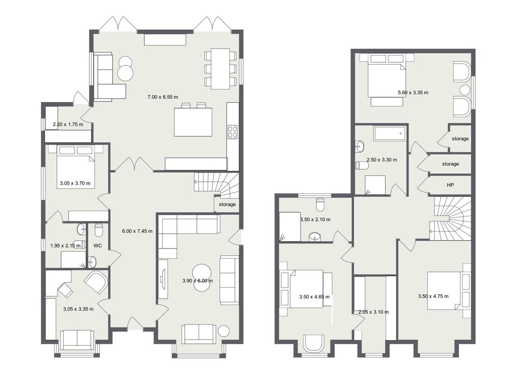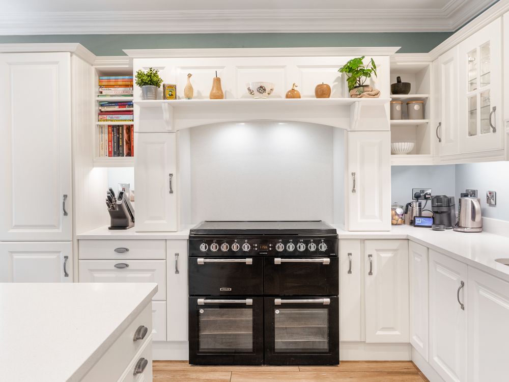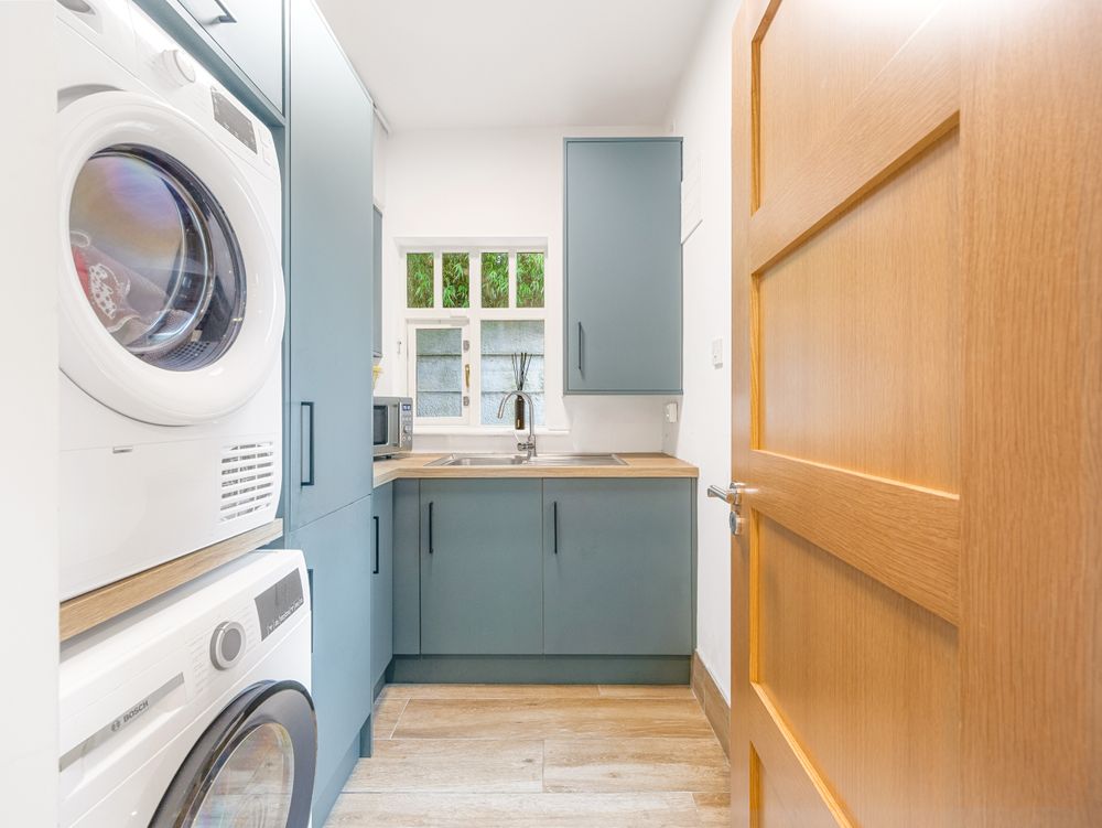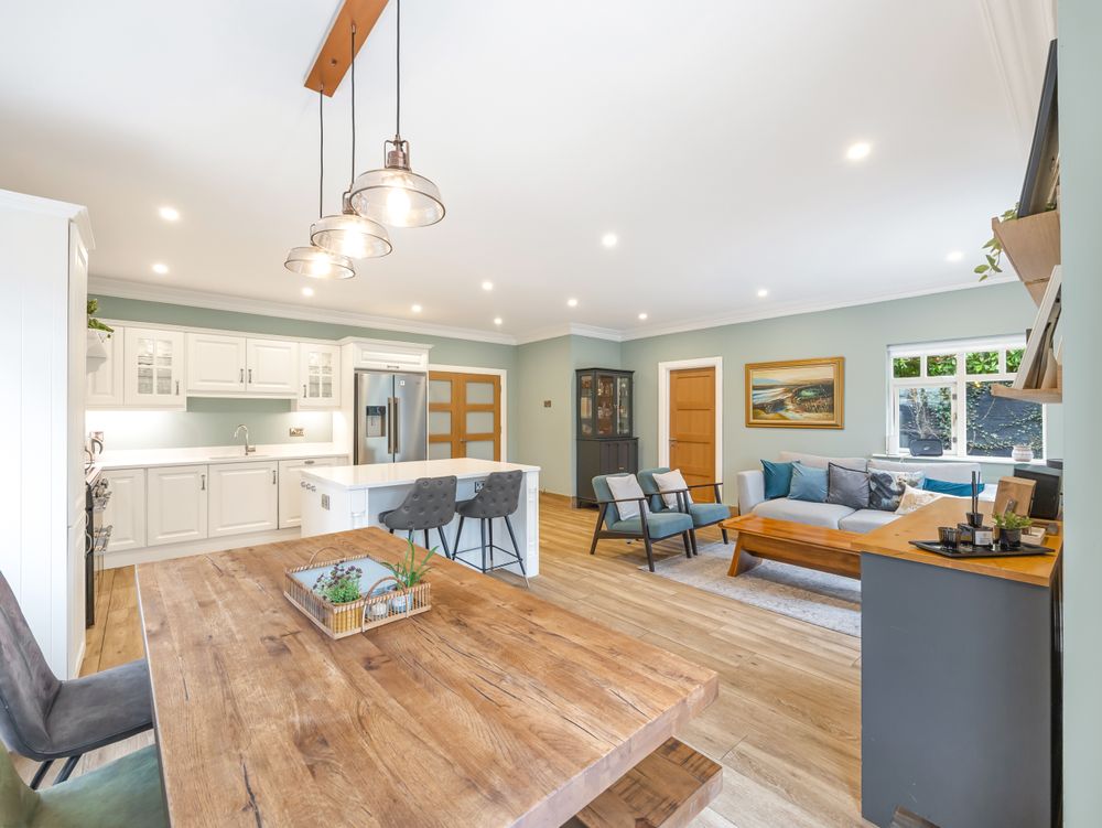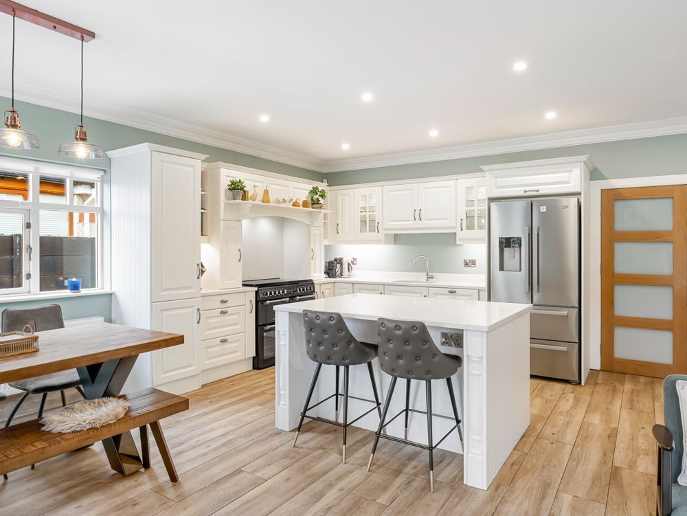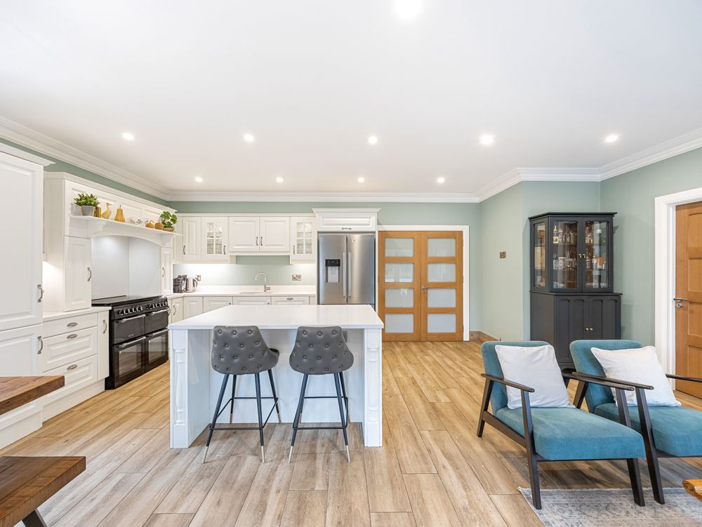 The heart of the home is the stunning open plan kitchen, living and dining area, a bright, expansive space framed by large rear windows and double patio doors that flood the room with natural light. The bespoke kitchen features elegant cabinetry, quartz countertops and a kitchen island that anchors the room beautifully, while a beautifully fitted utility room sits neatly to the left for added convenience. With ample room for both a comfortable sofa arrangement and a full dining suite, this impressive space is designed for both everyday family living and entertaining alike.