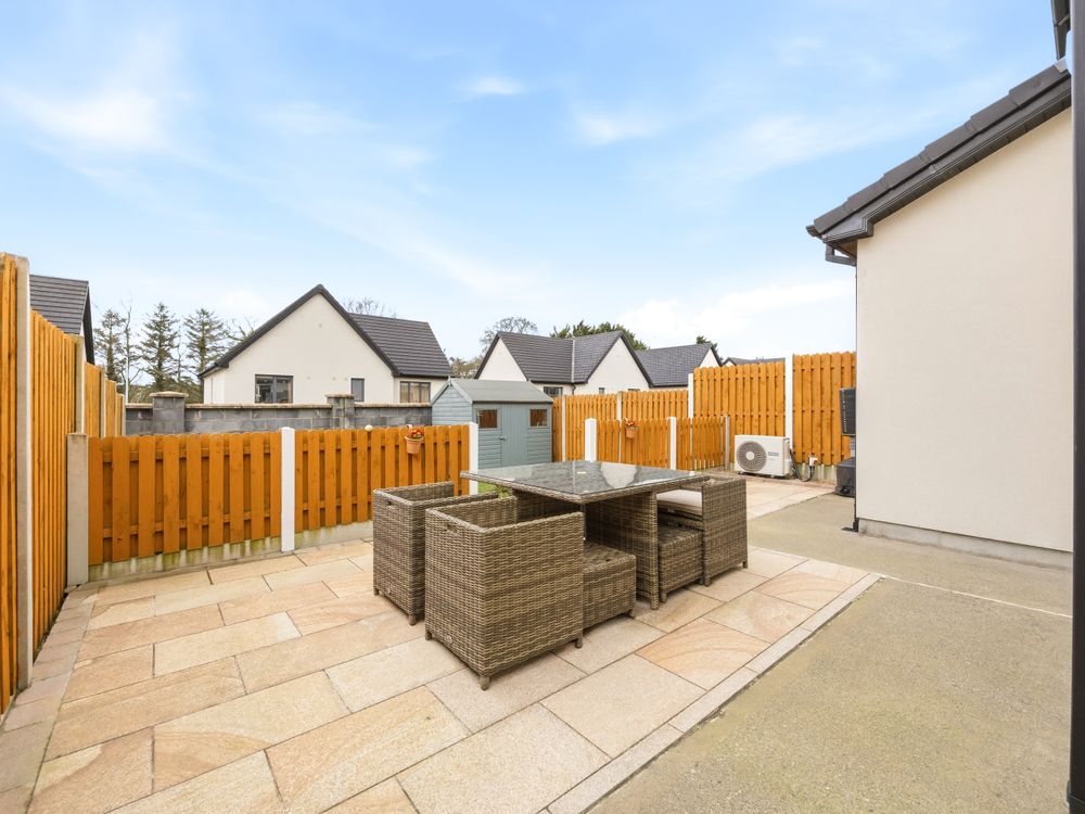The entrance hallway leads to a bright sitting room and a superb open plan high end kitchen with a large island and generous dining area. This impressive space offers ample storage and flows seamlessly into an additional lounge/TV area, creating the perfect hub for modern family living. Double doors open out to an beautiful paved area, ideal for outdoor dining and family get?togethers. A separate utility room adds further convenience.