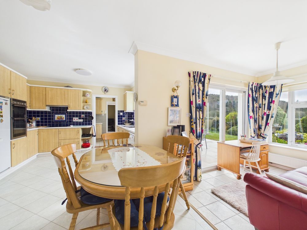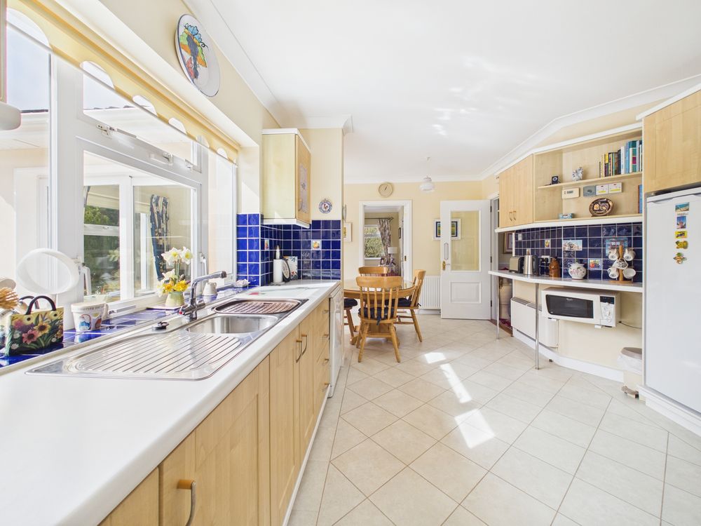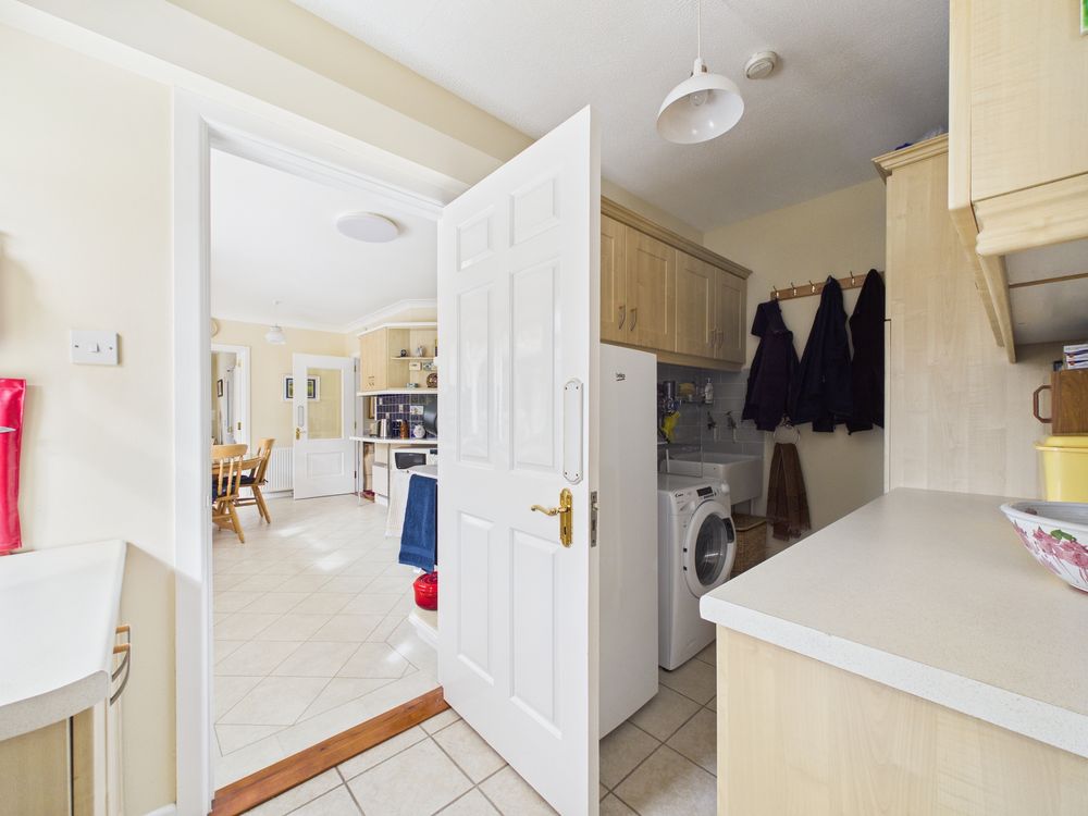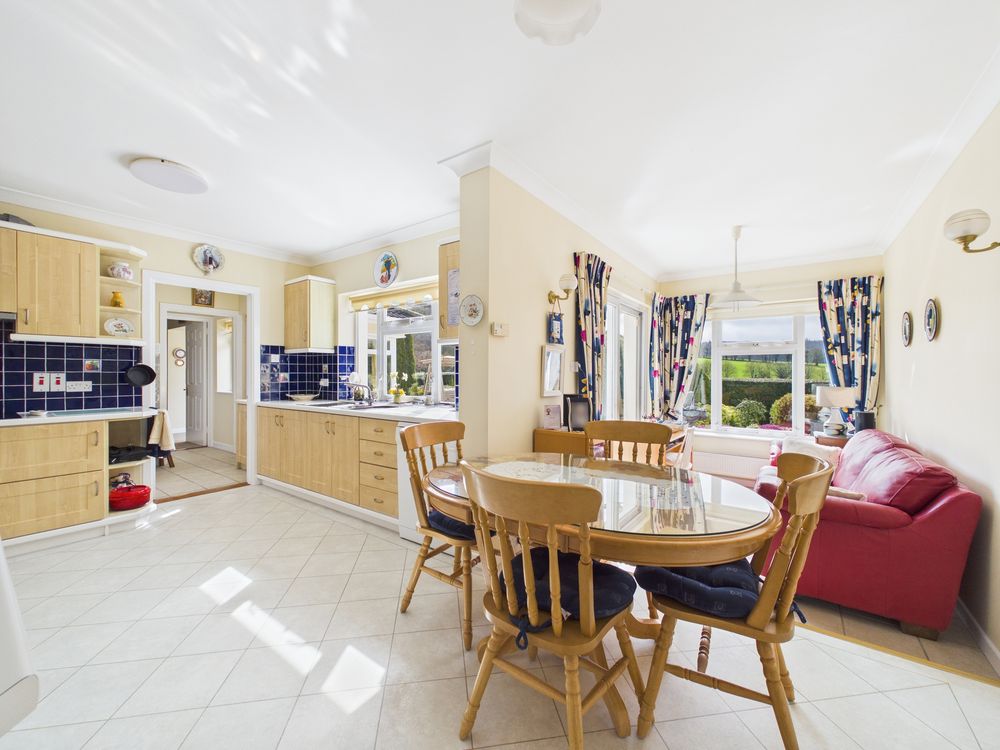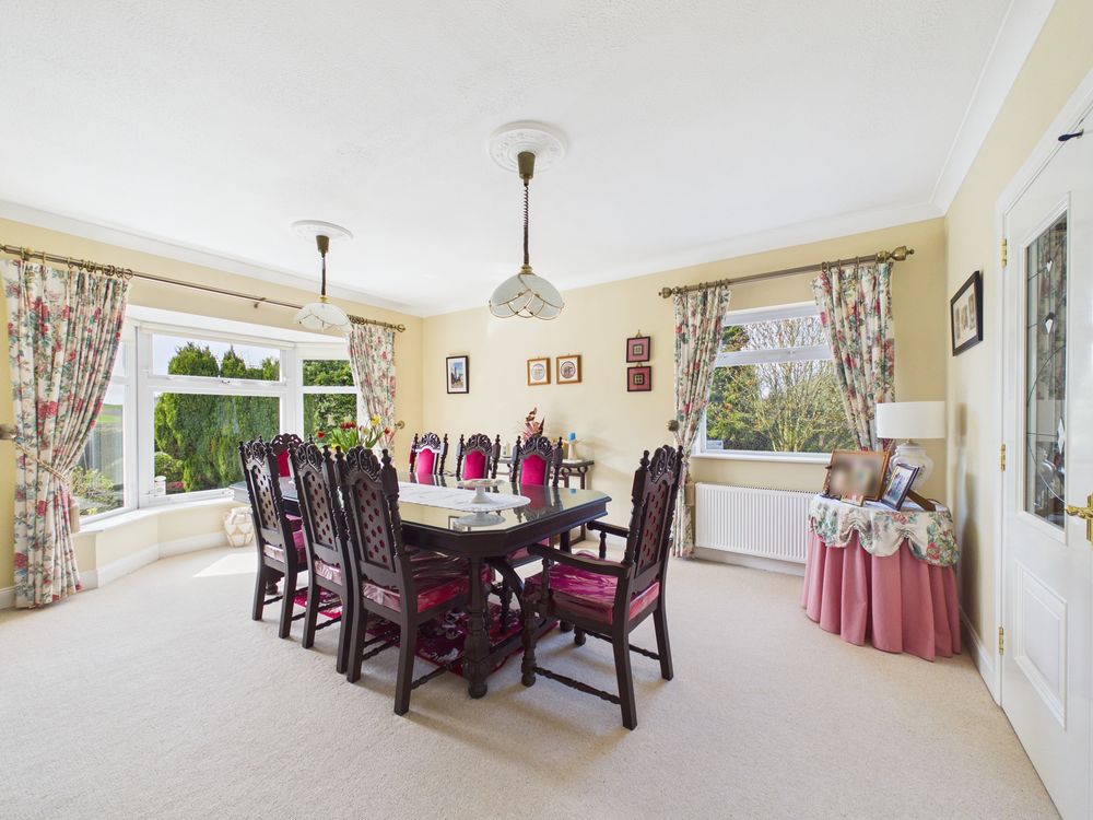 At the heart of the home lies a spacious kitchen and breakfast room which opens onto a tiled patio, designed for modern family living. This bright and practical space connects seamlessly to both the formal dining room and the adjoining sitting room, creating an ideal arrangement for entertaining and day-to-day life alike.