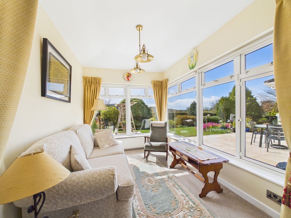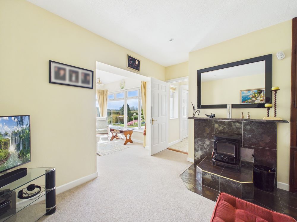 To the opposite side of the home, the second living room provides a relaxed and peaceful space, centred around a feature fireplace and complemented by a charming sun lounge. This additional reception area enjoys panoramic garden views and captures sunlight throughout the day, offering a tranquil setting for relaxation.