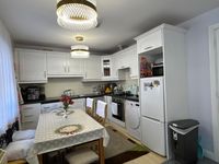 Mixture of tiled and carpet flooring along with a tiled backsplash and units at eye and floor level. The kitchen is plumbed for a dish water and washing machine. Windows overlooking the front.