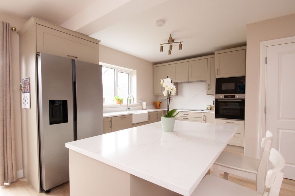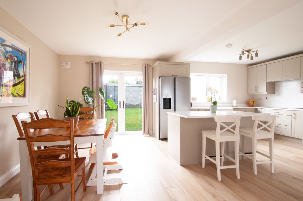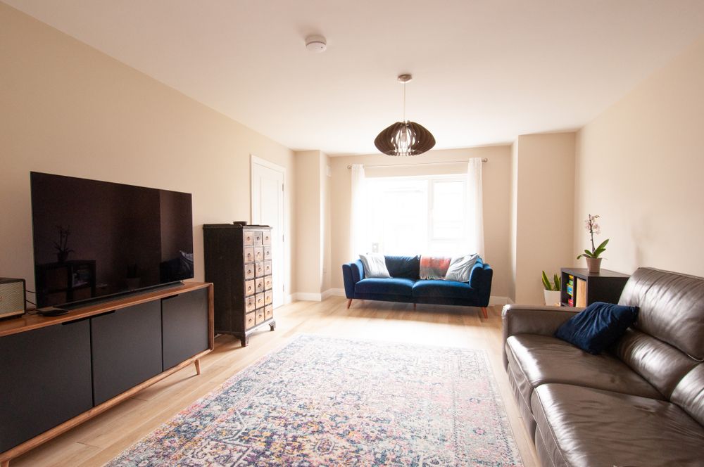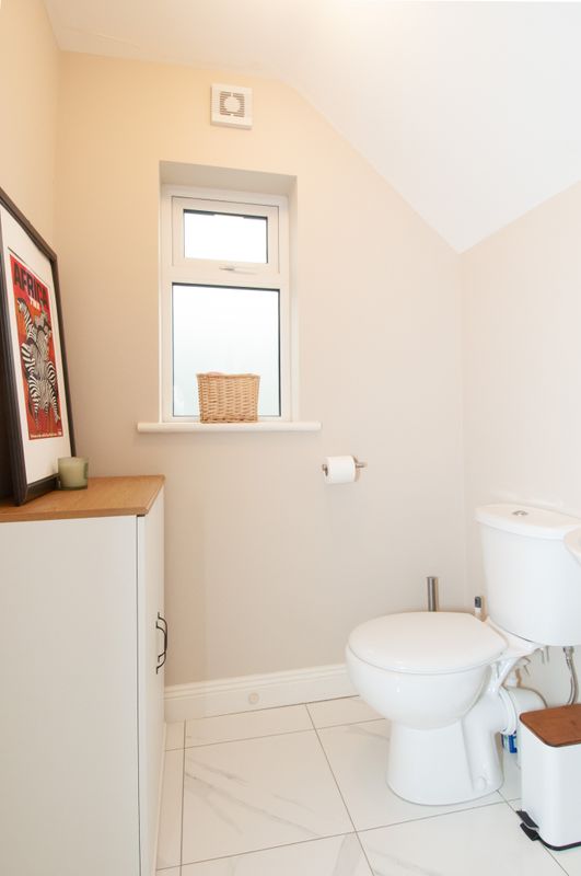 The heart of the home is the stunning, contemporary kitchen/dining area, complete with quartz countertops and central island, perfect for both everyday living and entertaining. A full suite of high quality appliances is included in the sale, featuring a Samsung American-style fridge freezer, Bosch hob, dishwasher, cooker, and microwave. Double doors lead from the kitchen/dining space into a bright, spacious and inviting living room, creating a wonderful flow between living areas. A separate utility room provides additional storage and convenience, complete with a Whirlpool washing machine and dryer. A guest W.C. completes the ground floor accommodation.