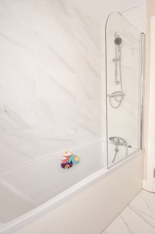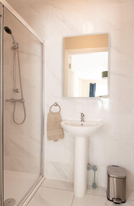 Tiled flooring and additional floor to ceiling wall tiles, shower, w.c and w.h.b