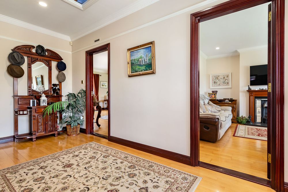 Solid wooden flooring, feature stained glass ceiling skylight, coving