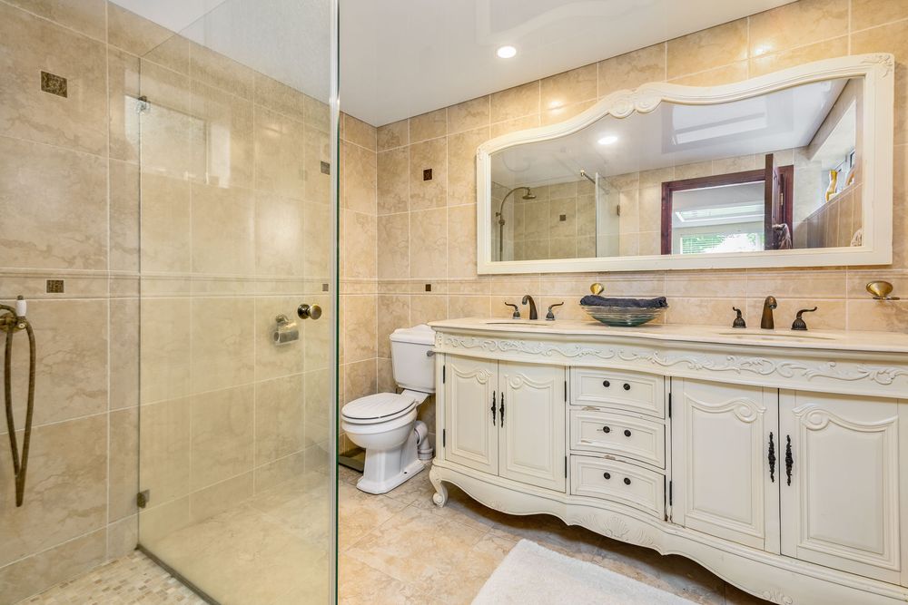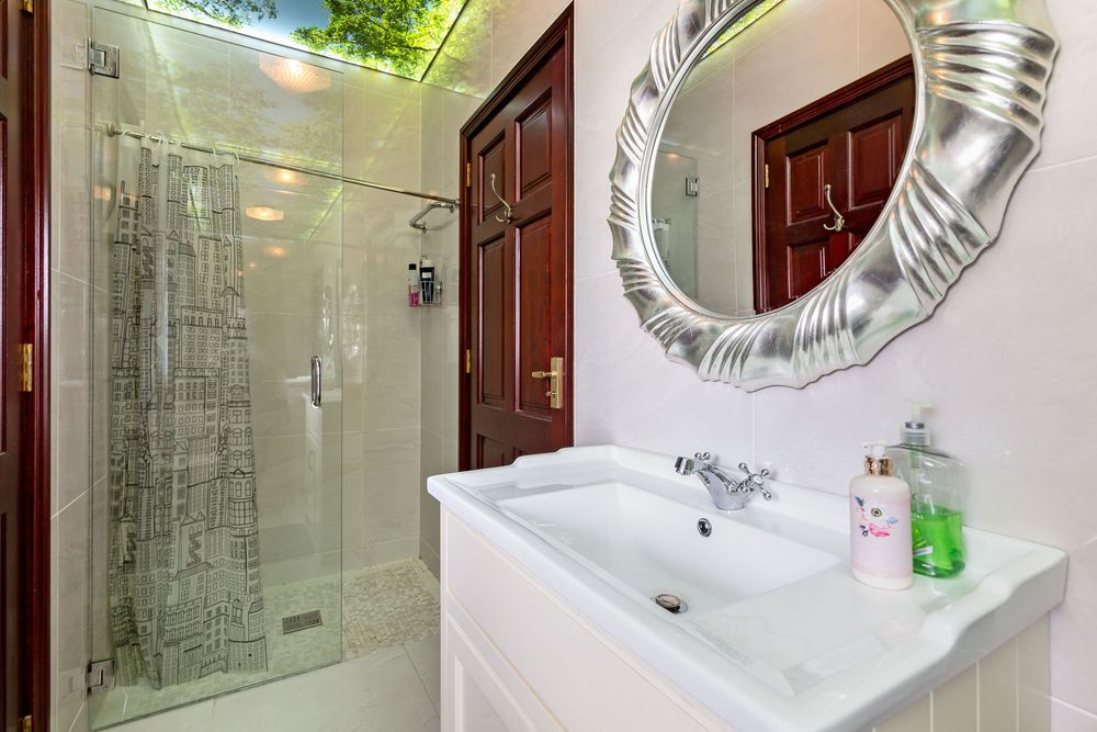 wc, whb, shower, full wall & floor tiling, large mirror, feature lit ceiling with decorative design