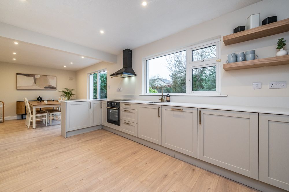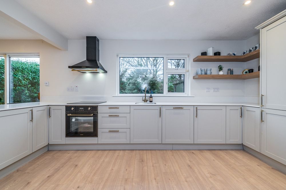 With laminate floor, new built-in ground and eye level units with quartz countertops and quartz upstand, stainless steel sink, fitted Klarstein oven and hob, recessed lights, sliding patio door to rear.