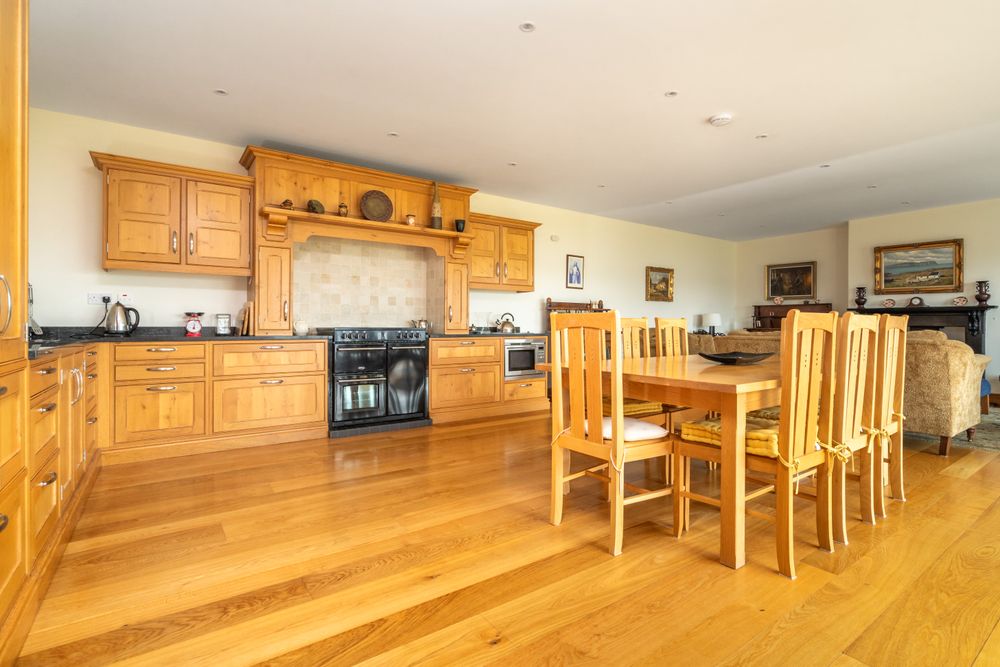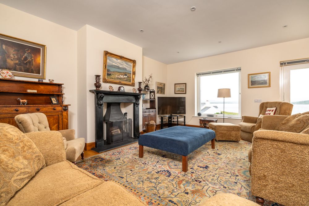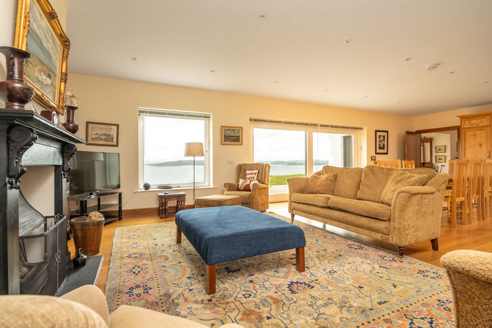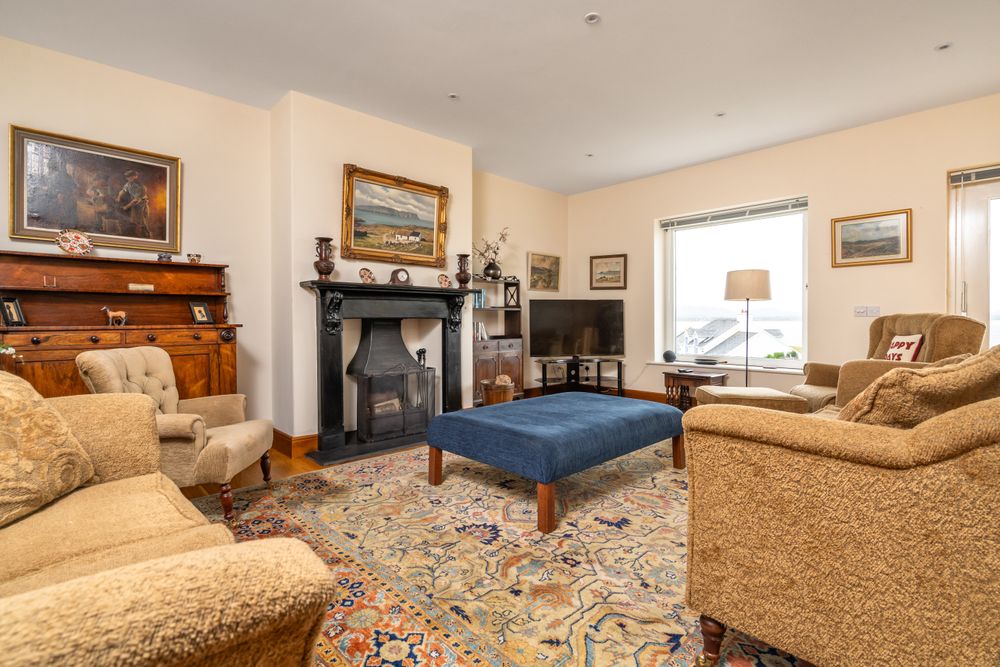 On arrival, the entrance hall creates a welcoming first impression, leading into a bright and spacious lounge with views to the front garden and the sea view beyond. The centerpiece of the home is the open-plan sitting, dining, and kitchen area which is perfect for both family living and entertaining, and benefits from a feature fireplace and doors opening directly to the patio and it’s panoramic views. The kitchen is fitted with sleek cabinetry and offers ample space for family dining, while the adjoining living area is filled with natural light benefitting from a southerly aspect. Accessed off the lounge is a WC, a utility room which provides practicality and gives access to an integral garage for storage.