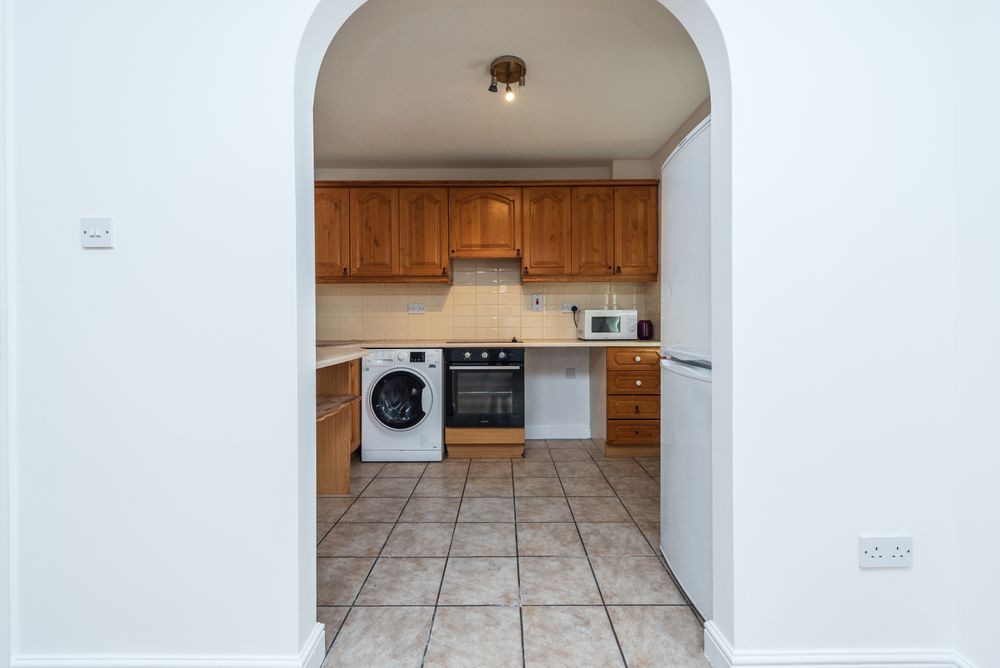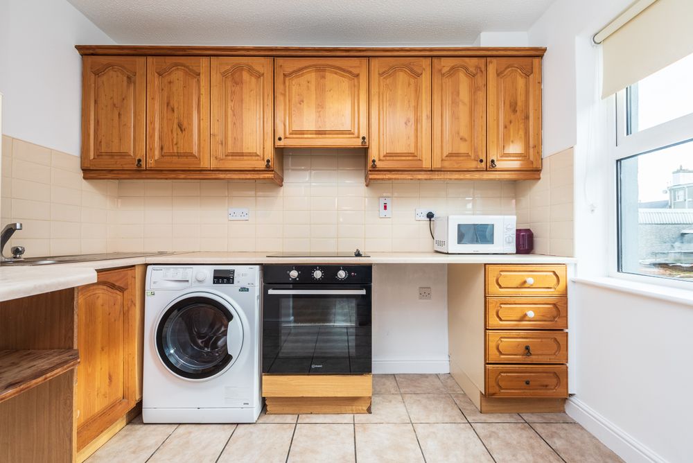 Hotpoint fridge/freezer, electric oven, hob & extractor, built-in ground and eye level units, Hotpoint Washer/Dryer, stainless steel sink, tiled floor and surround.
