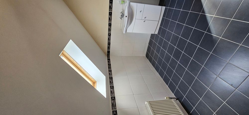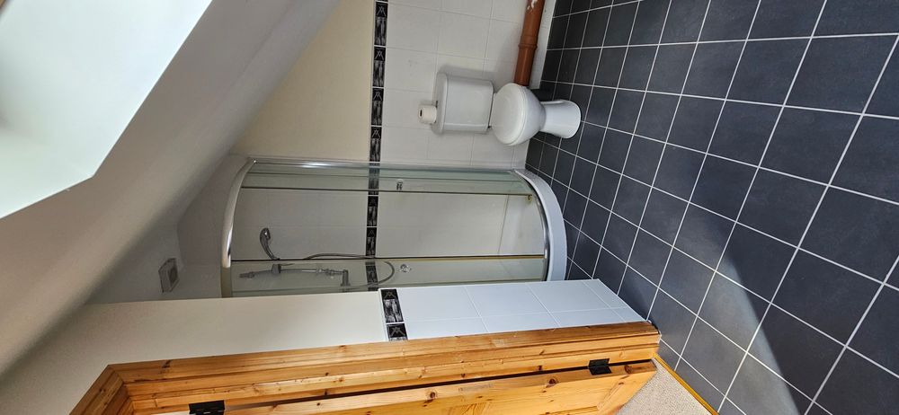 Tiled floor, velux window, part tiled walls, corner shower cubicle, wc, whb.