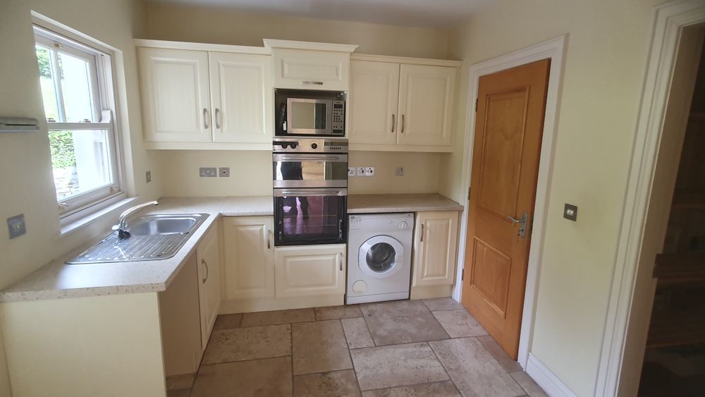 Fitted units with high and low level presses, electric oven, plumbed for washing machine, tiled floor, back door