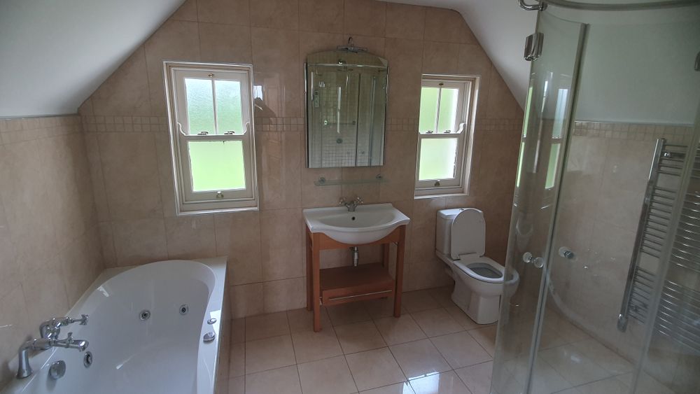 Walk in wardrobe, Ensuite with W.C., W.H.B., Shower, bath tiled floor and walls