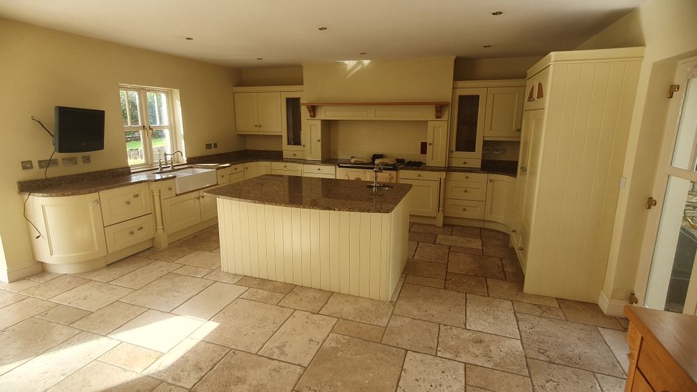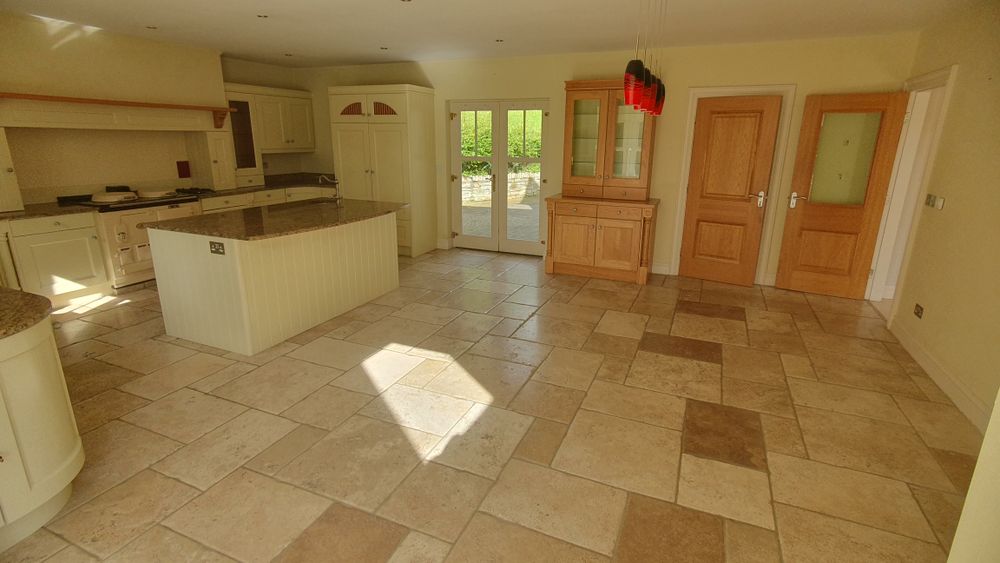 Fitted kitchen with high and low level units, Aga range, Neff gas hob, central island, laminate work surfaces, tiled floors, double doors to outside
