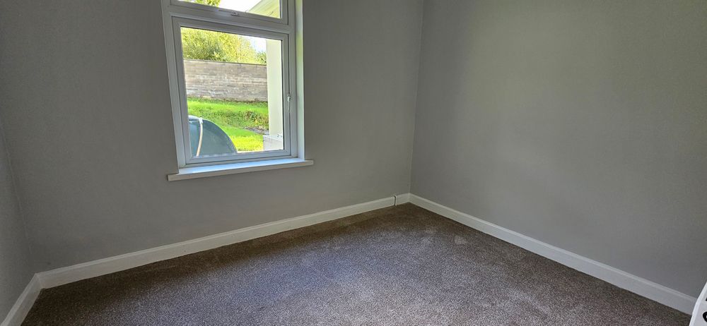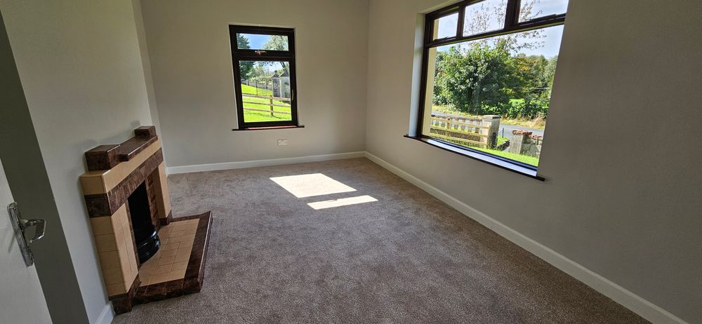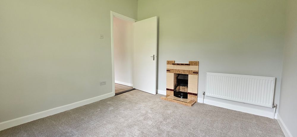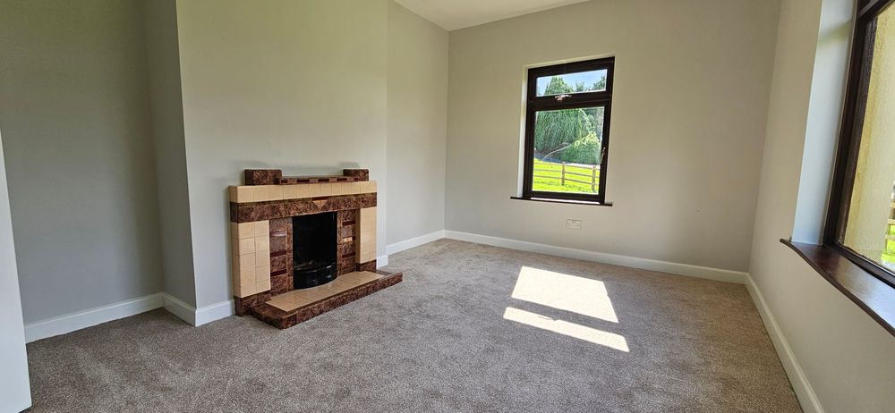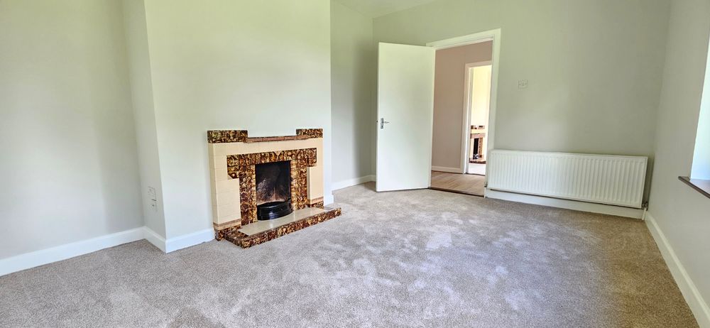Living room at front with new carpet, radiator, windows to two elevations, power points, open fire with tiled suround and hearth.