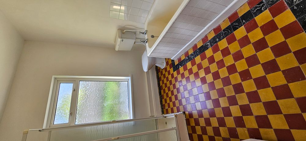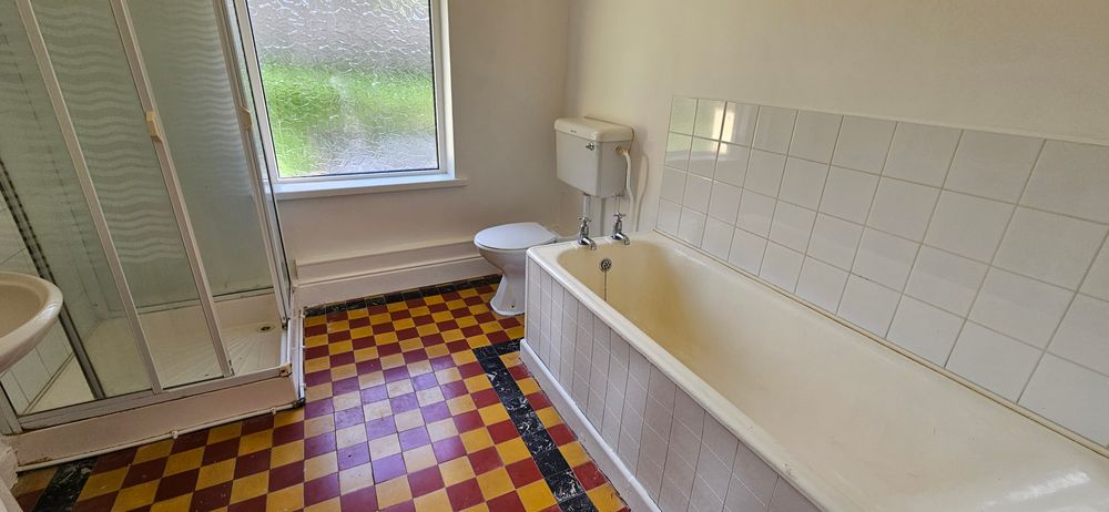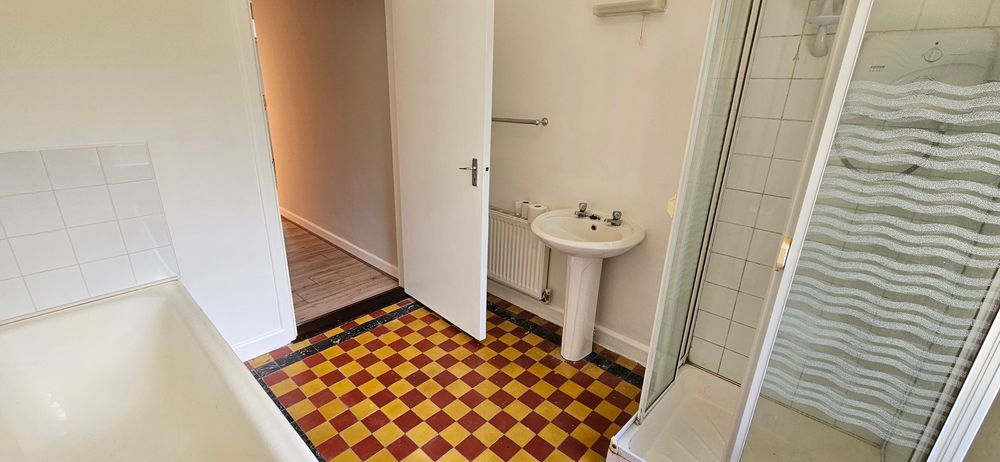 Tiled floor, tiled shower cubicle with electric shower, fan heater, radiator, shaving light, wc, whb and bath.
