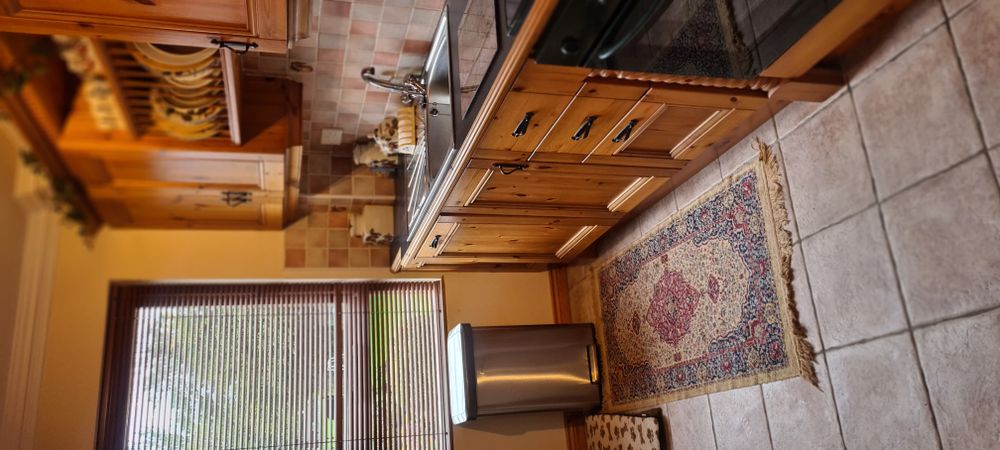Living room to the front of the house with open plan dining and kitchen area. Open fireplace with gas fire, windows to the front and glass door allowing lots of light and window to the rear and side. Power points and tv point. Open through to kitchen area.