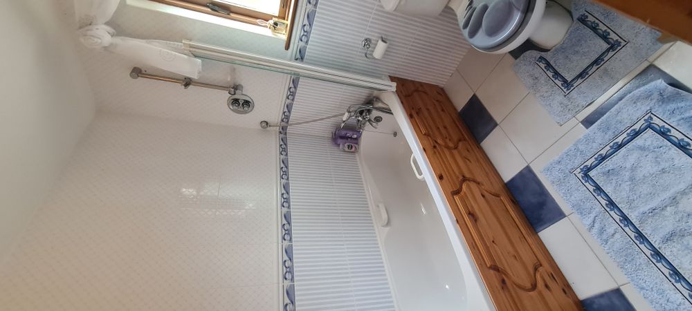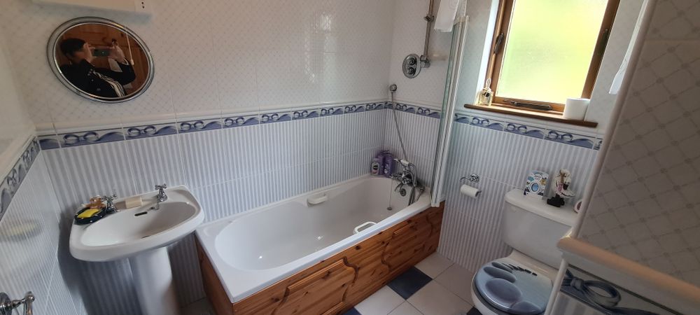 Bathroom with tiled flooring, window to rear, whb, wc bath with shower over, half tiled walls.