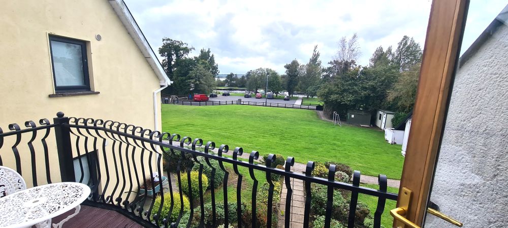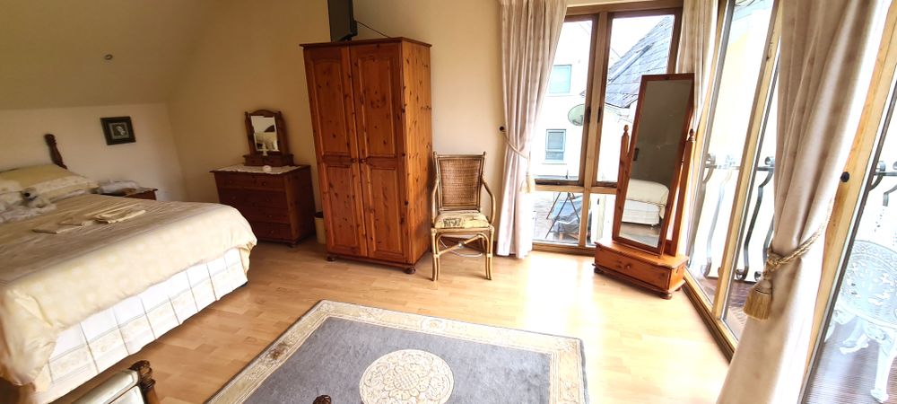Very large and bright double bedroom on the first floor with doors leading out to balcony area overlooking the harbour, laminated flooring, electric storage heater, tv and power points, door to Jack and Jill bathroom.