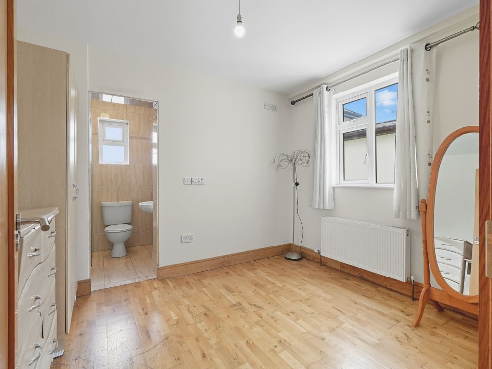 Finished with a laminate wood flooring. There is some free-standing wardrobes and this room is en-suite.
