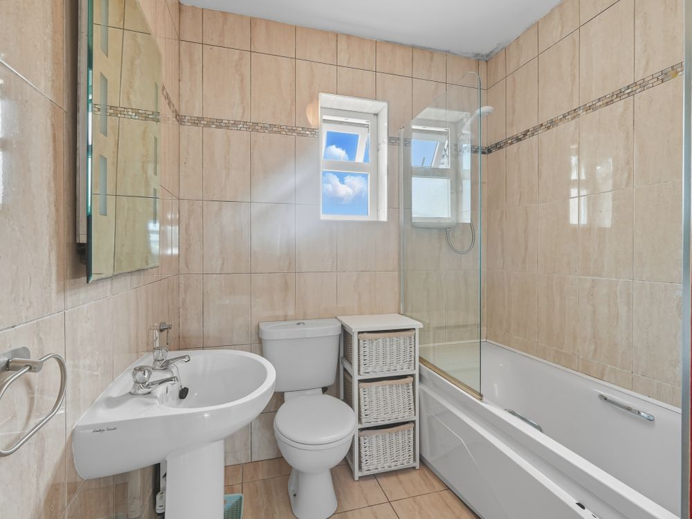 Fully tiled. Includes WC, WHB and corner shower with a pumped shower fitted.