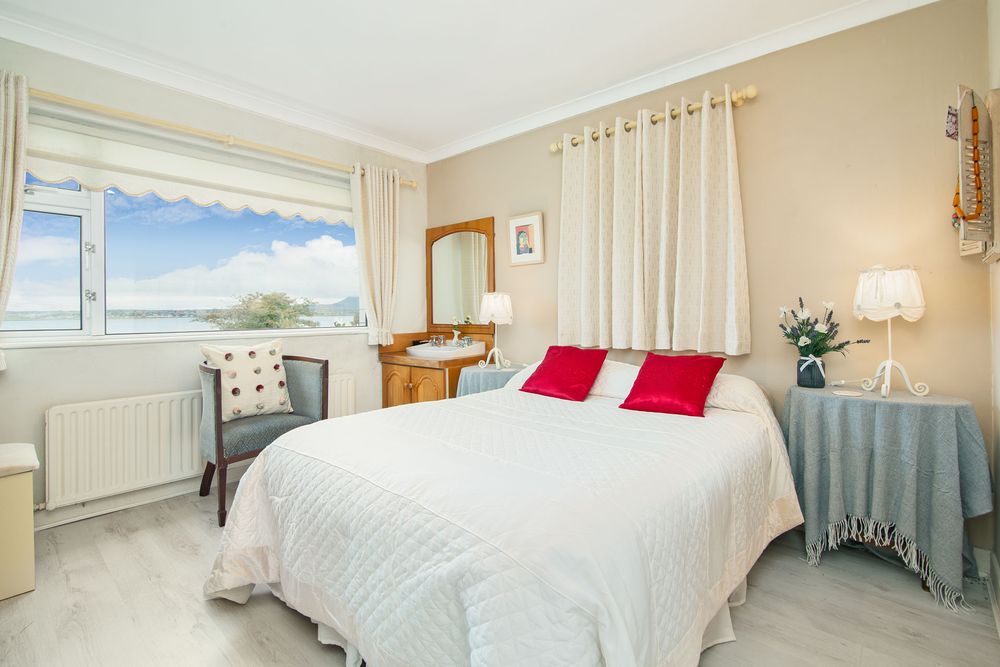 Carpet flooring. Open fireplace. Front facing window with view of Sligo bay. Archway to study.