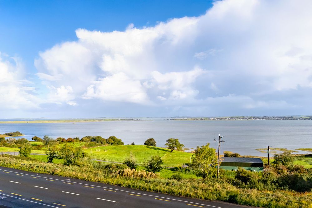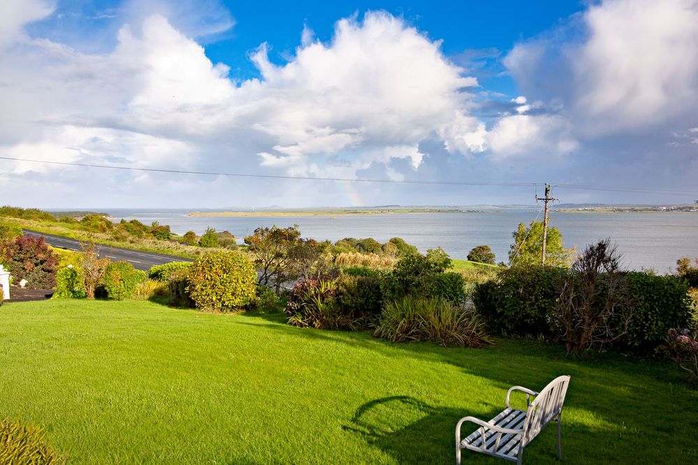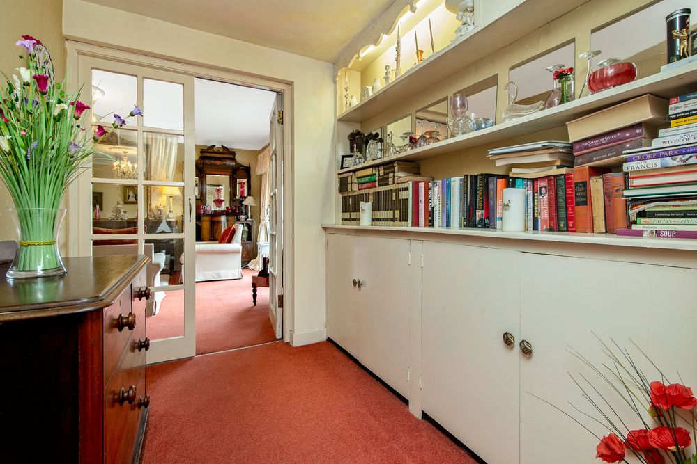 Carpet flooring. Feature fireplace. Grass paneled doors to study space. Front facing window with view of Sligo bay.