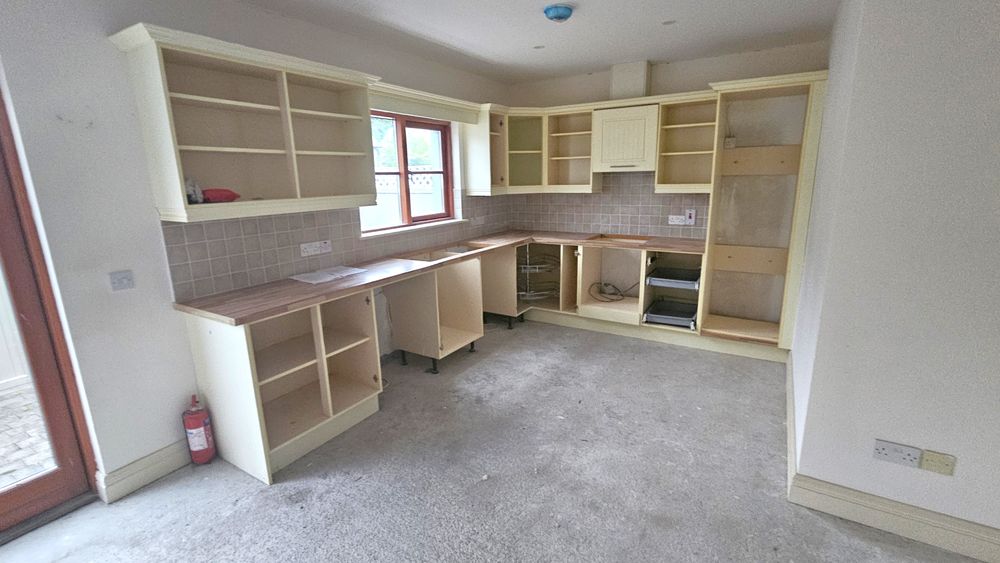 Kitchen carcass units fitted, counter top fitted, splash back tiled, double doors to sitting room, French doors to enclosed private back yard, phone point, power points, recessed lights.