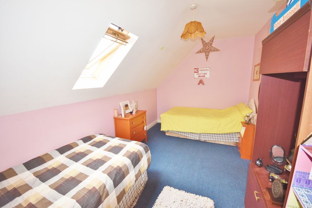 Spacious twin room. Side east-facing aspect. Velux and rear window. Carpeted.