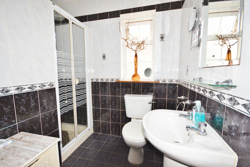Wash hand basin. WC. Shower unit with Triton power shower. Fully tiled.