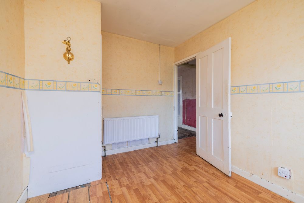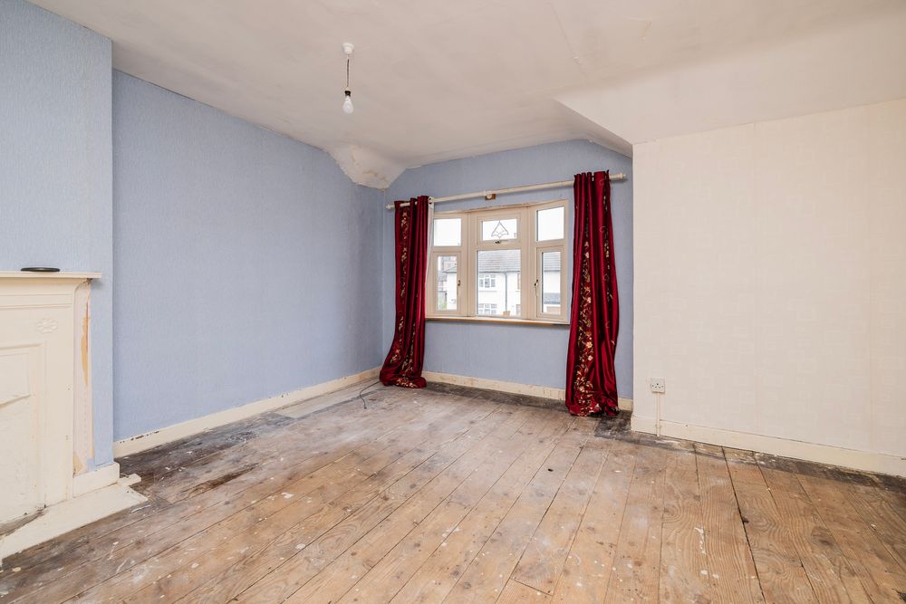 Spacious reception room looking onto the front garden. Open fireplace. Understairs storage cupboard.