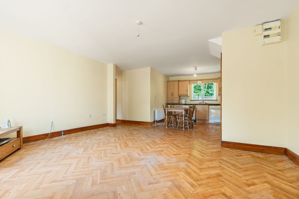 The home is well designed, with a large open-plan kitchen and living area that creates a bright and welcoming atmosphere, ideal for both relaxation and entertaining. Off the kitchen, a practical storage room provides additional functionality. A hallway leads to two generously sized bedrooms and a fully fitted bathroom, ensuring comfortable living for a variety of lifestyles. To the front of the property, a large parking area adds further convenience. With a C1 BER rating and efficient gas-fired central heating, the property is both comfortable and cost-effective to run.