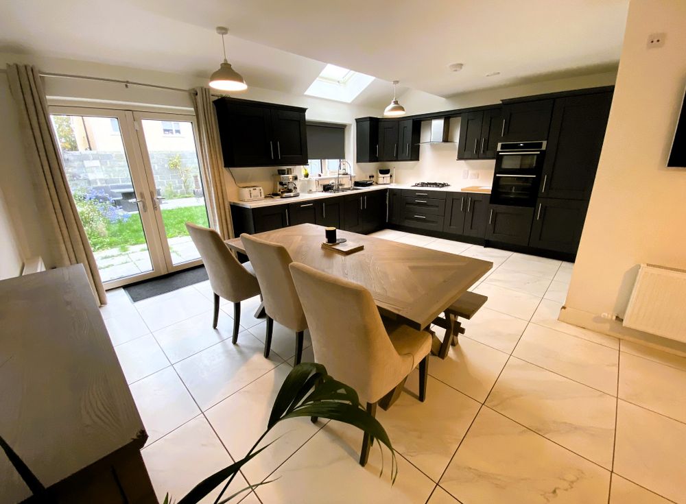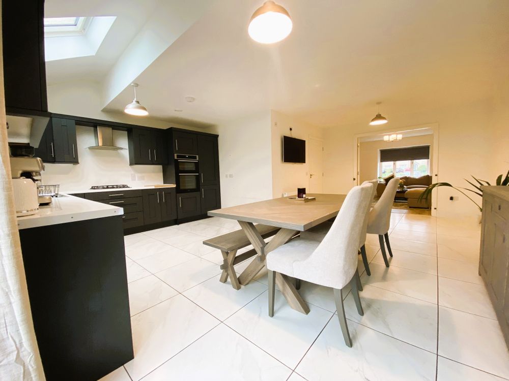 Beautiful L-shaped Kitchen/Dining and Living Space with extra ceiling height - tiled flooring, contemporary fitted kitchen with tiled upstand, integrated fridge/freezer, dishwasher, oven and hob, large Velux window, double doors to garden and double doors to living room, light fittings.