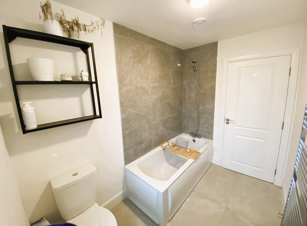 Floor tiling, partially tiled walls, bath, WC, hand wash basin, light fitting