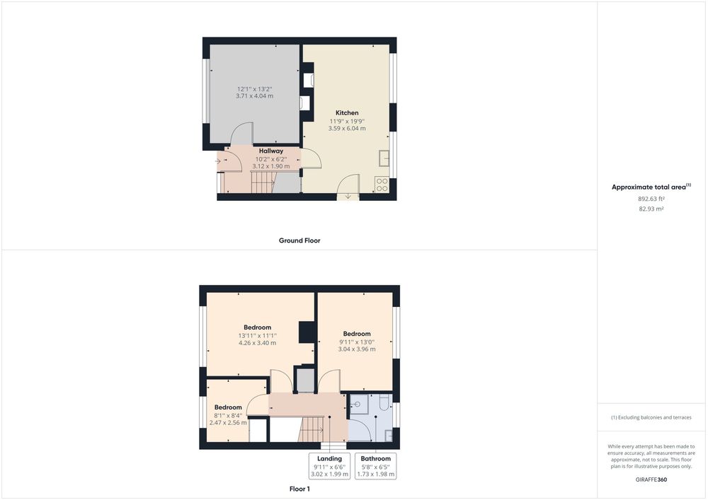 The accommodation comprises an entrance hall, living room, and a kitchen/dining room on the ground floor. Upstairs includes three bedrooms (all with fitted wardrobes) and a family bathroom.