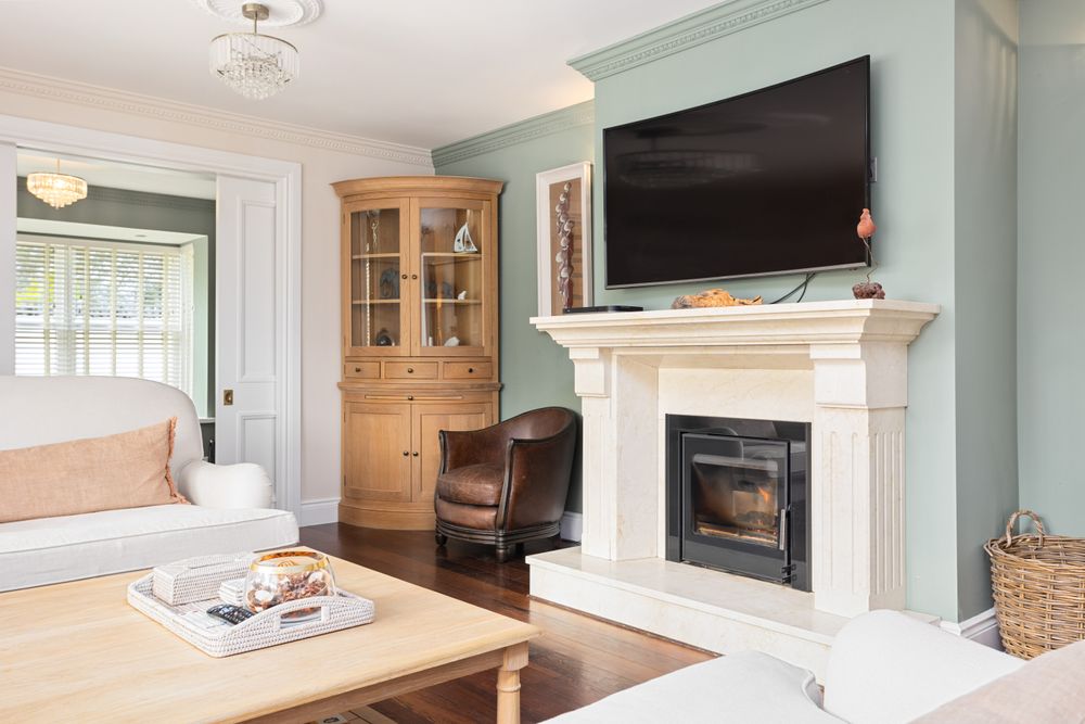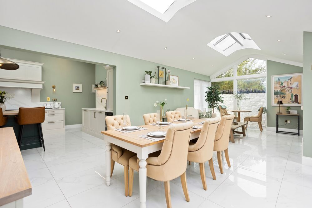 The spacious layout of this home has been thoughtfully designed to create a beautiful flow throughout, ensuring every room connects seamlessly and feels both elegant and practical. A bright and welcoming porch, finished with wall panelling, Italian porcelain tiles, and soft recessed lighting, leads into a spacious entrance hall that immediately shows the home’s warmth and character. The living room is a beautifully proportioned space with a feature bay window and a solid fuel insert stove framed by a marble surround giving a lovely cosy feel to the room. Pocket doors connect to an elegant modern office.