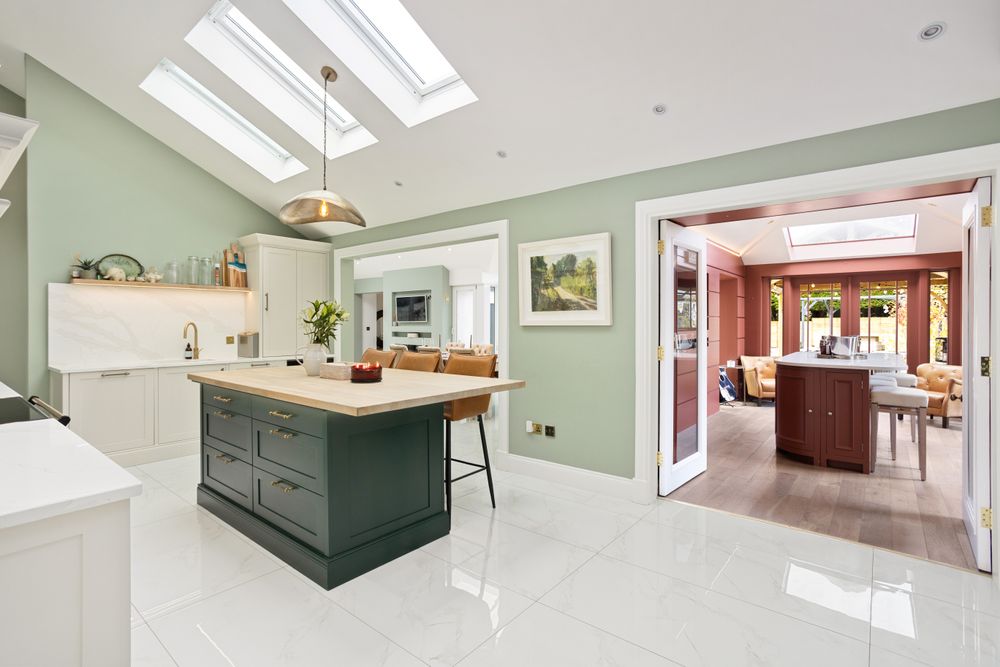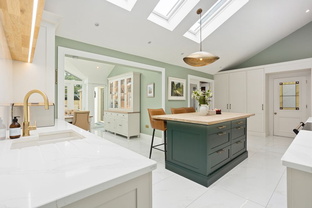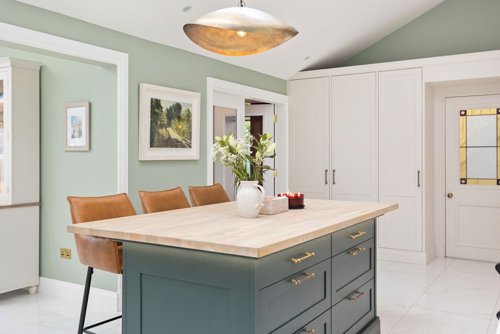 Beautiful contemporary bespoke Neptune painted kitchen with quartz countertop and modern solid oak butcher block countertop with recessed lighting on the island finished with nickel sockets, light switches and kitchen tap and double doors leading into the Wine Room,