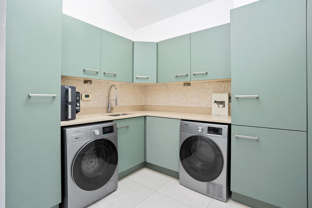 The heart of the home lies in the bespoke Neptune painted kitchen, finished with a quartz countertop and solid oak butcher block island, the finish of the kitchen is completed with beautiful antique brass Burlington handles. Double doors lead through to the wine room, painted in a rich Neptune Chestnut tone, featuring bespoke shelving, a marble-topped island, wine cooler, and engineered solid smoked oak flooring. French doors open to the pergola-covered terrace, perfect for entertaining guests.