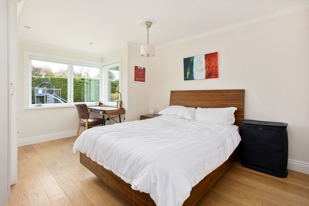 Dual aspect window facing the rear garden, roller blinds, bespoke built in wardrobes, engineered solid oak floors, recessed lights and ceiling light.