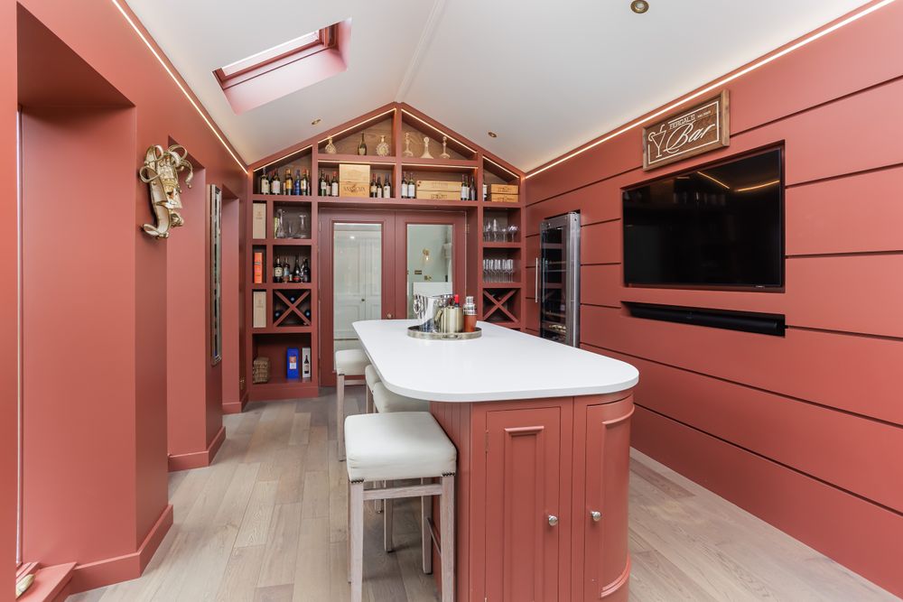 Exceptional wine room painted a beautiful warm Neptune chestnut colour with bespoke shelving, recessed led lighting, island with rounded corner and marble countertop, wine cooler, feature dropdown windows overlooking the rear garden and engineered solid smoked oak flooring. The wine room double doors opens up out on the newly installed Pergola area for entertaining.