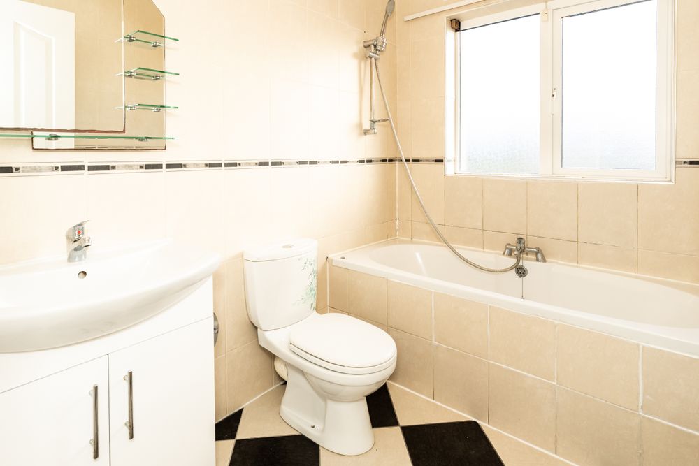 Tiled shower enclosure, linoleum flooring, electric shower, toilet, WHB
