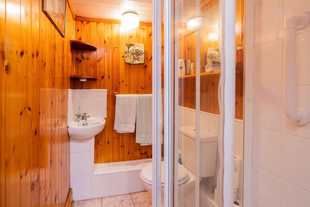 With wc, wash hand basin set in a built-in vanity unit providing all bathroom storage plus shower cubical home to a Triton T90z electric shower unit.