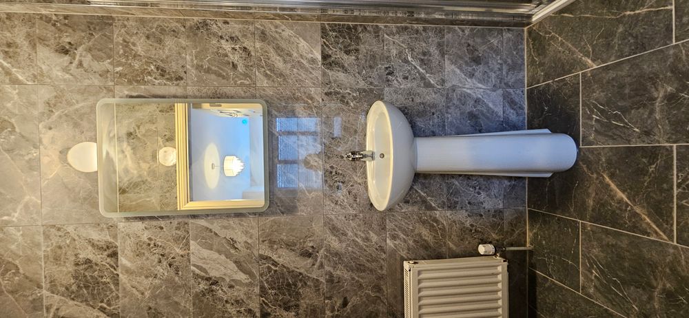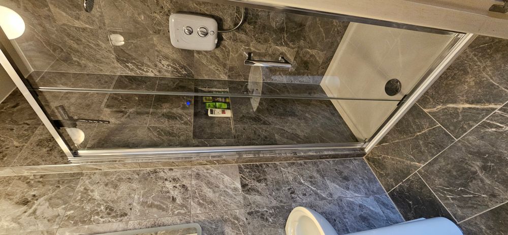 Tiled floor, tiled shower cubicle with electric shower, radiator, wc, whb, shaving light with socket,.