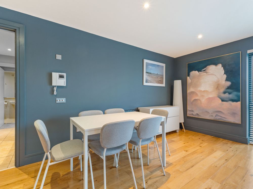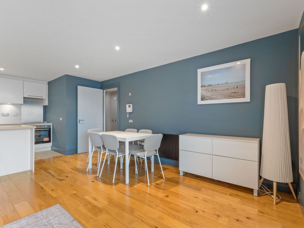 This is beautifully finished with a fully fitted kitchen with all fitted appliances, a central island unit complete with breakfast bar counter and the kitchen area has tiled flooring. The dining and living area is finished with an engineered wood flooring. This room has wonderful natural light coming from the large glazing and glazed door that opens out onto its private balcony overlooking the centre court yard within the scheme.