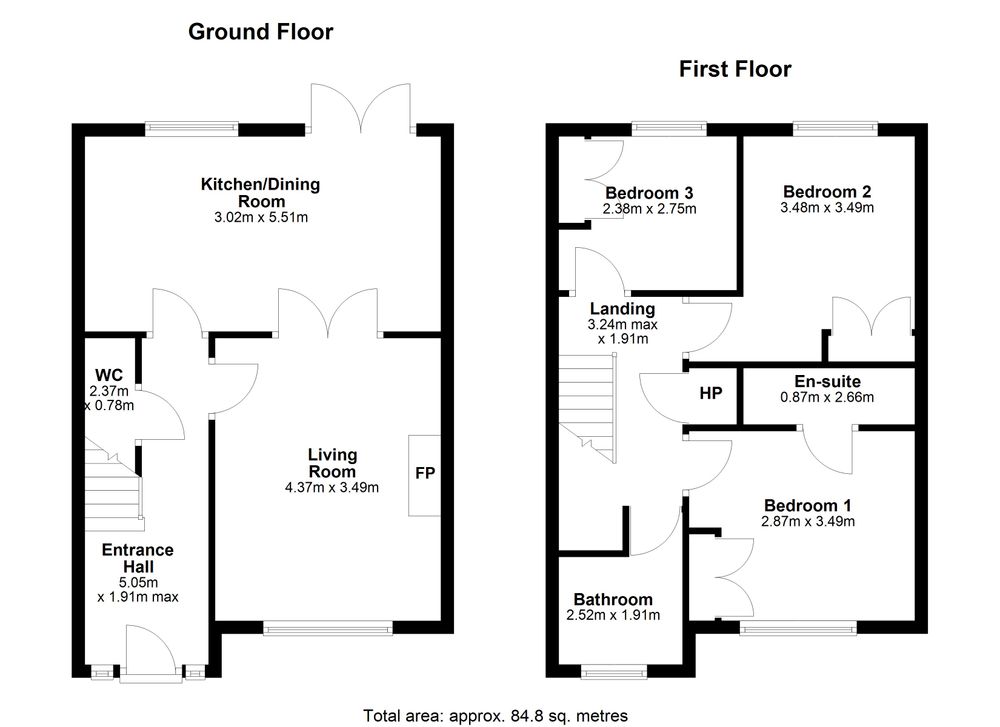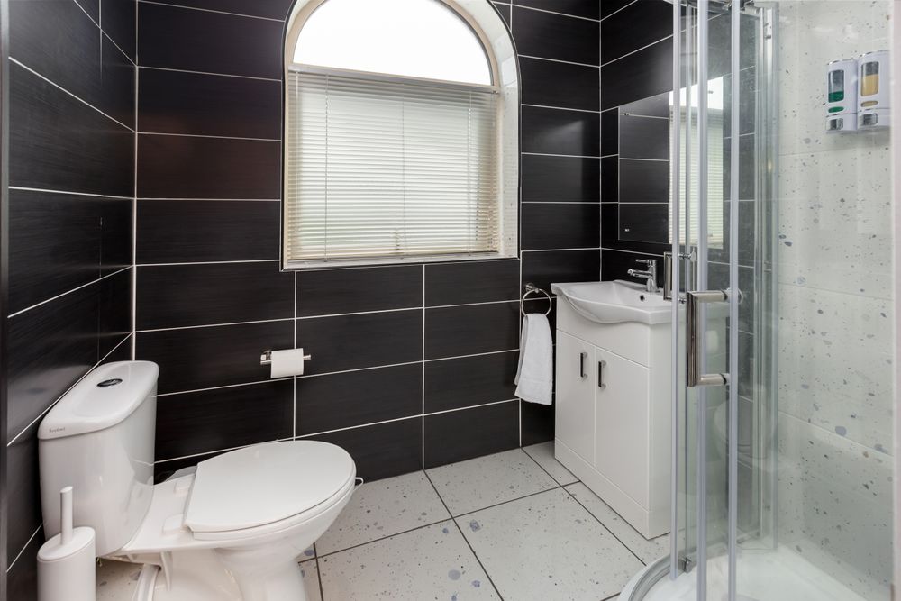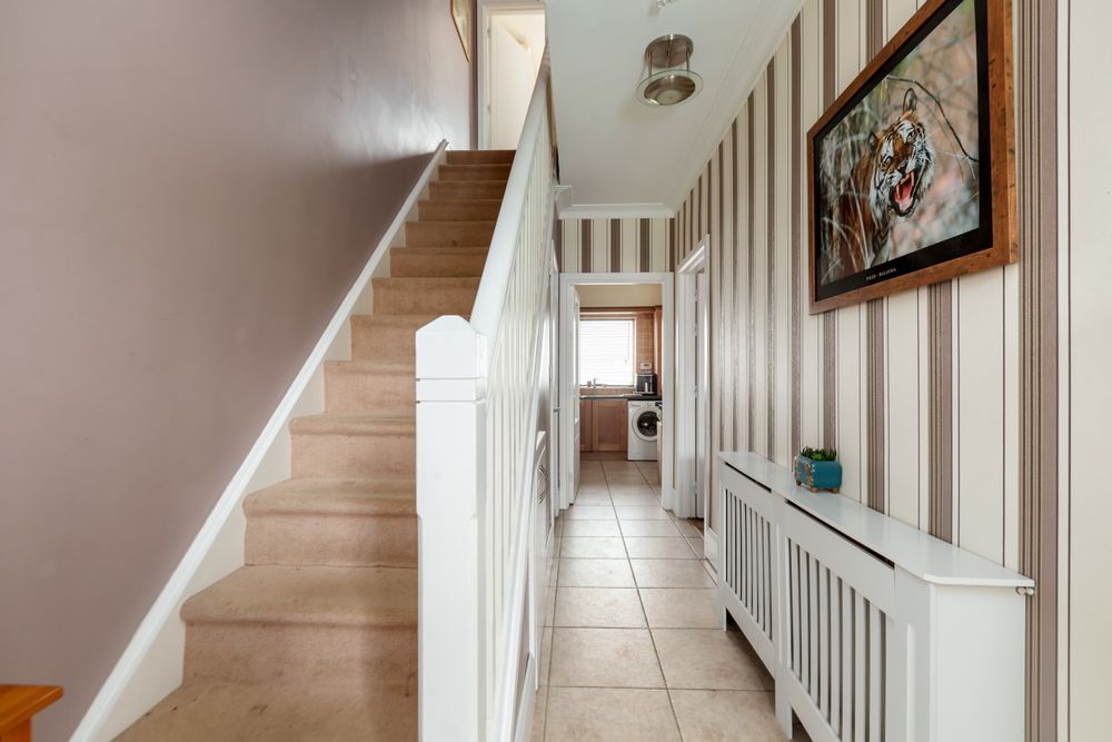 Upstairs, the layout includes three bedrooms: two doubles and one single. The main bedroom comes with fitted wardrobes and an en-suite shower room. The remaining bedrooms are served by a modern family shower room finished in a contemporary tiling scheme. With three bathrooms in total, the house works well for a busy household.