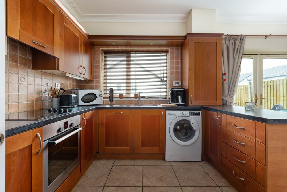 To the rear, the kitchen/dining room runs the full width of the house. It includes a good range of fitted units, tiled splashback, integrated oven and hob, and a useful breakfast bar. There is plenty of space for a family dining table, and French doors open straight onto the rear deck and garden, making day-to-day living straightforward and functional.