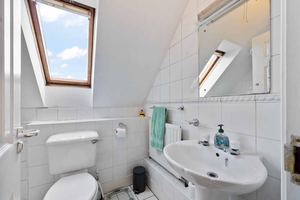 Tiled from floor to ceiling in appealing tiles, the use of a Velux window offers fresh air and light. Three piece white sanitary ware to include electric shower fitted in tiled shower cubicle. vanity sink with mirror and light as well as WC.