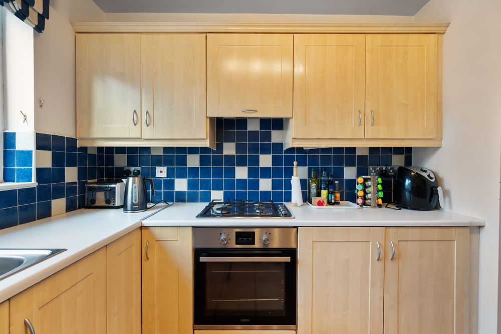 Spacious and fitted with floor level units. Counter top space with single drainer sink and fully tiled above. Appliances include washing machine and tumble dryer.