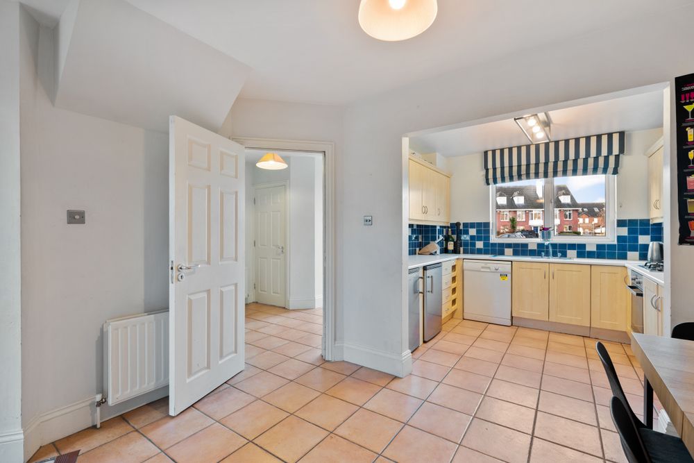 While open plan the kitchen and dining room have well defined spaces. The kitchen is set to the front of the property with a large picture window bringing in lots of natural light. The kitchen is arranged in a complete U shape with fitted units at both floor and eye level. Appliances are fitted to include fridge and freezer standing side by side along with dishwasher. A built in oven with gas hob set within the worktop has integrated extractor hood above. The area over the extensive worktop surface is tiled in tones of blue and white captured further in the soft furnishing of the kitchen blind. The dining room is set off the kitchen with plenty of space for a six to eight seater dining table. The entire room continues the same tiled floor to that of the entrance hall accentuating the space.